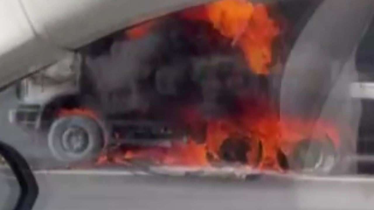 Kuzey Marmara Otoyolu’nda beton pompası aracı bilinmeyen bir nedenle alev alev yanmaya başladı. Kısa sürede alev topuna döndü.
