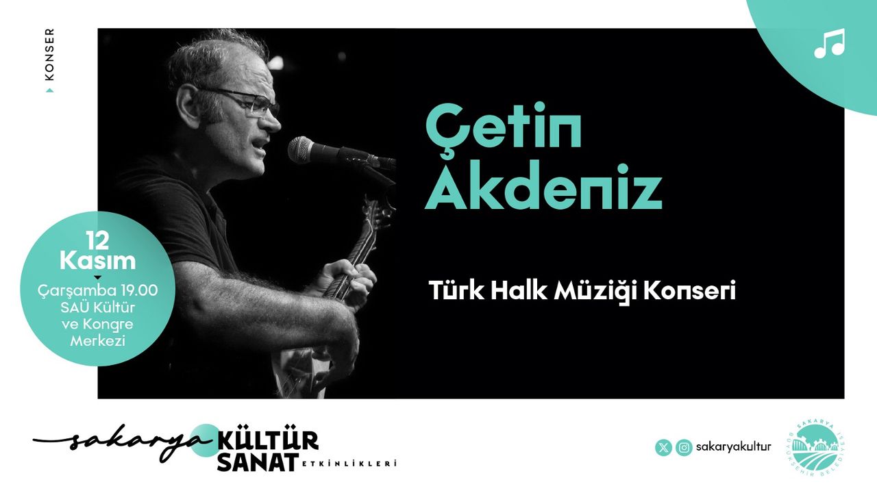 Aynı gün saat 19.00’da Sakarya Üniversitesi Kültür ve Kongre Merkezi’nde gerçekleşecek Çetin Akdeniz Türk Halk Müziği Konseri, dinleyicilere türkülerin en seçkin örnekleriyle unutulmaz bir akşam yaşatacak. Halk müziğinin güçlü sesi Çetin Akdeniz, Anadolu’nun ezgilerini Sakaryalı sanatseverlerle buluşturacak.