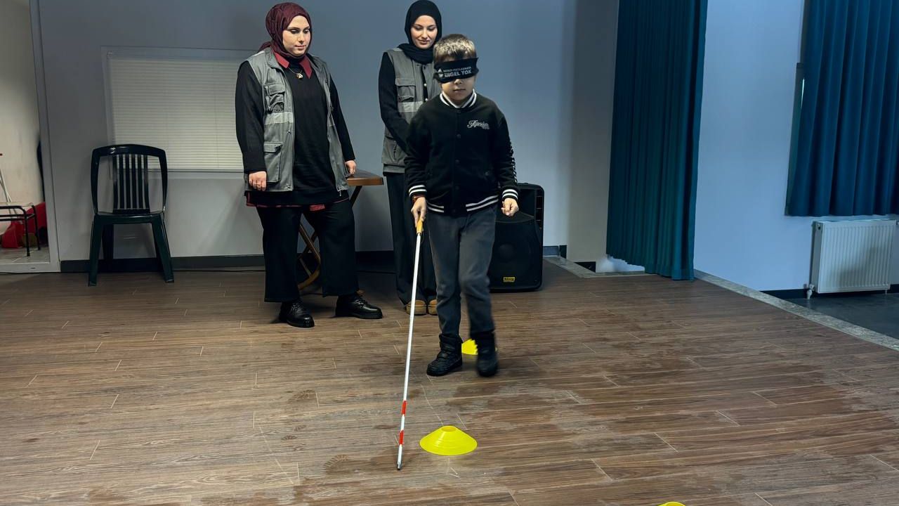 Engelli Hizmetleri Şube Müdürlüğü personelleri tarafından düzenlenen programda öğrenciler; “göz bandı ile yön bulma”, “dokun, hisset, tahmin et”, “ses ile yön bulma” ve “göz bandı ile su doldurma” gibi oyunlara katılarak görme engelli bireylerin yaşadığı deneyimleri birebir hissetme imkânı buldu.