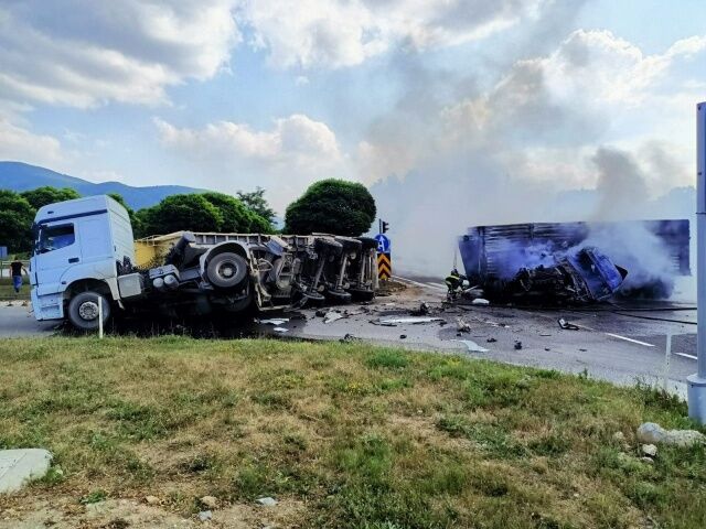 İki tır kavşakta birbirine girince bir anda alevler yükseldi