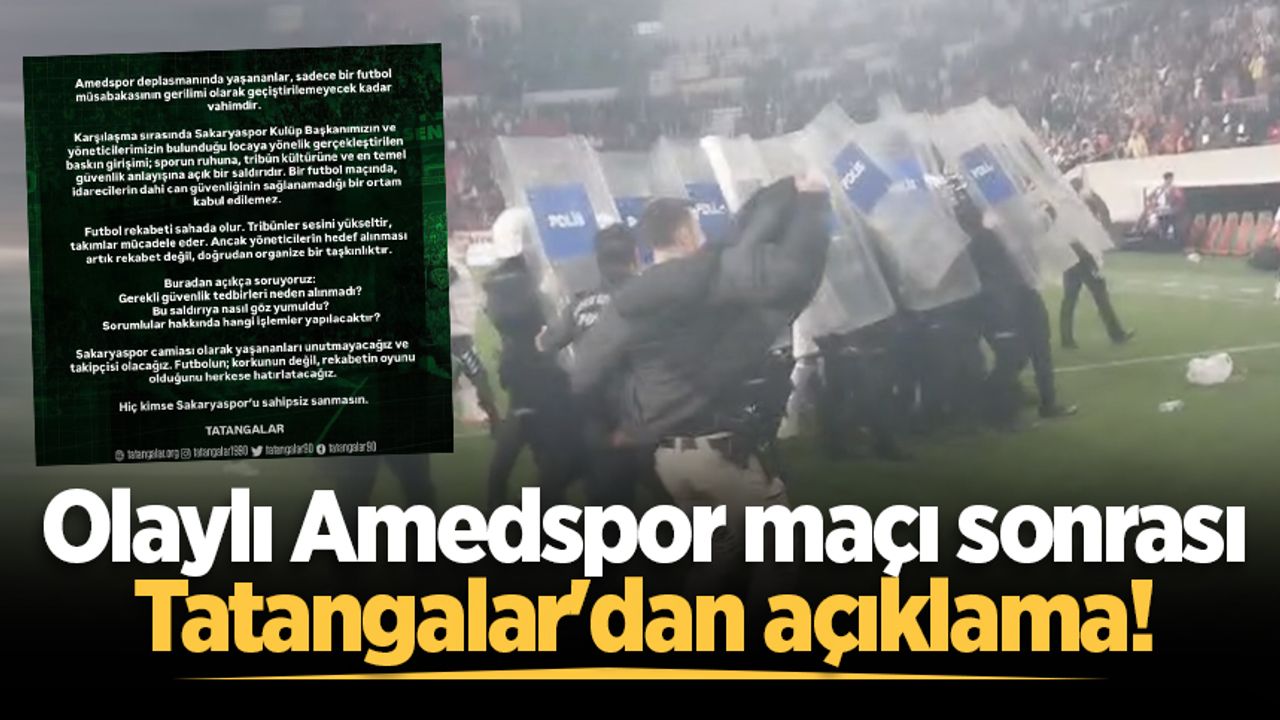 Sakaryaspor'un taraftar grubu Tatangalar, Diyarbakır deplasmanında oynanan ve olaylı geçen Amedspor maçının ardından sosyal medya hesabından açıklama yaptı. Yapılan açıklamada, "Yöneticilerin hedef alınması artık rekabet değil, doğrudan organize bir taşkınlıktır." denildi.