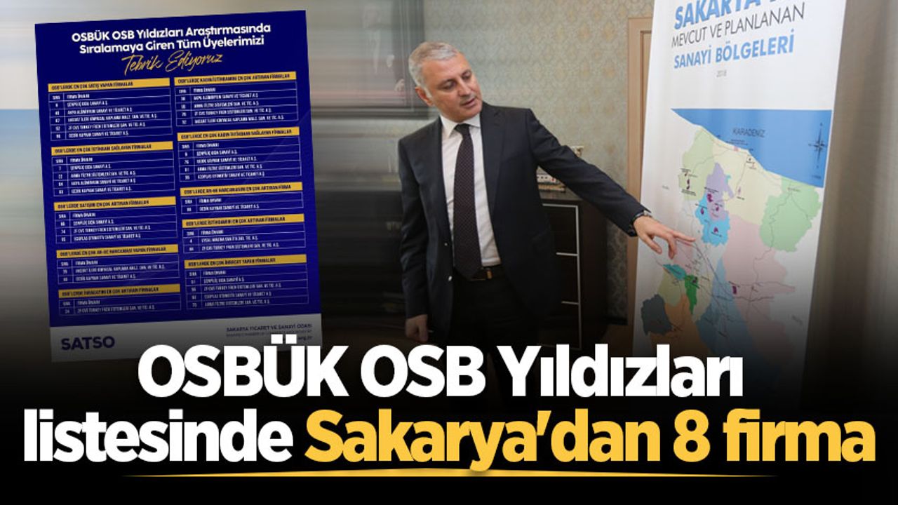 Organize Sanayi Bölgeleri Üst Kuruluşu (OSBÜK) tarafından bu yıl 5’incisi gerçekleştirilen OSB Yıldızları araştırmasında sonuçlar açıklandı. OSBÜK tarafından gerçekleştirilen araştırmanın sonuçları Ankara’da gerçekleşen ödül töreninde açıklandı. Açıklanan sonuçlara göre Sakarya’dan 8 firma 10 kategoride bulunma başarısı gösterdi.