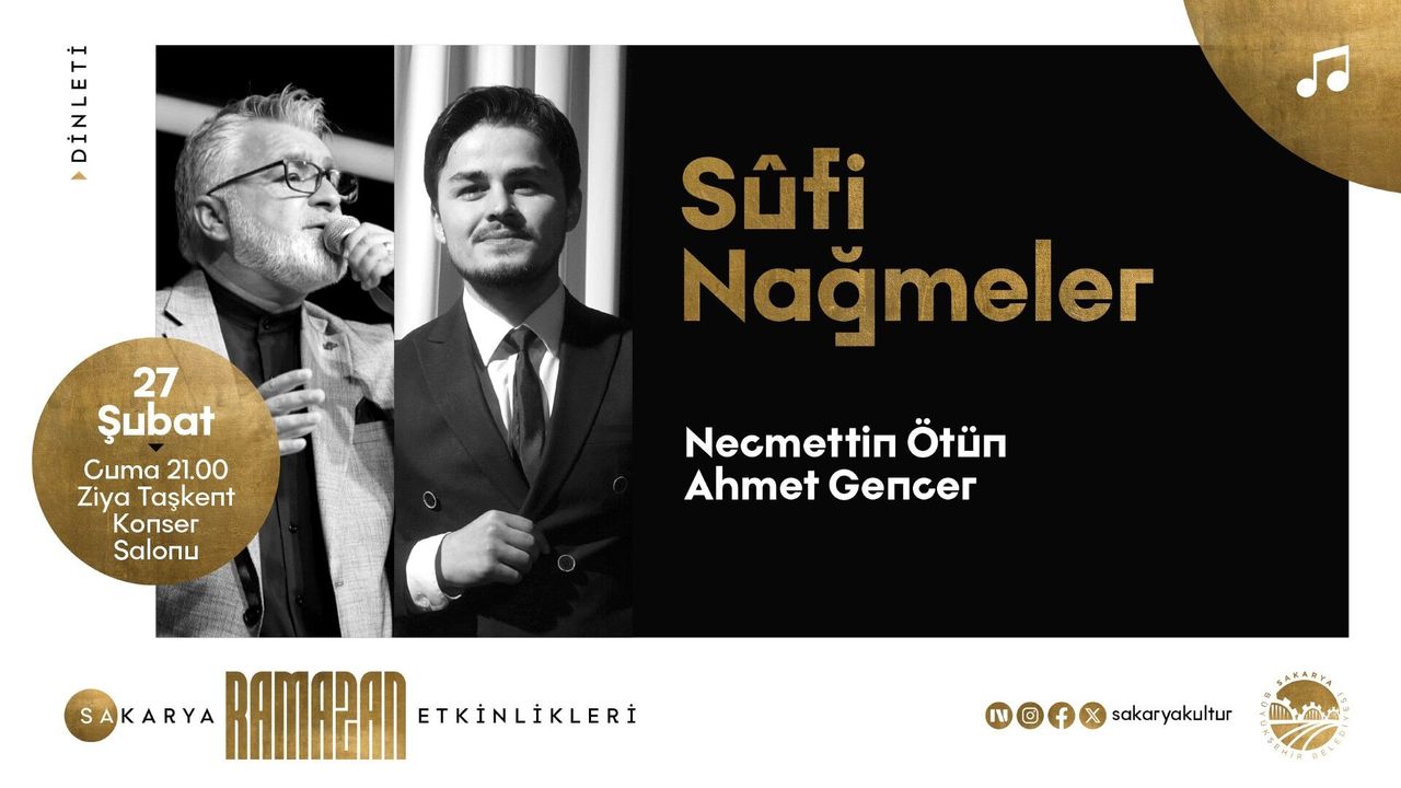 Sakarya Büyükşehir Belediyesi, Ramazan ayının manevi iklimini zenginleştiren kültürel etkinliklerine hız kesmeden devam ediyor. Bu kapsamda 27 Şubat Cuma günü, “Sufi Nağmeler” programıyla müzikseverleri huzurlu bir akşam bekliyor.
