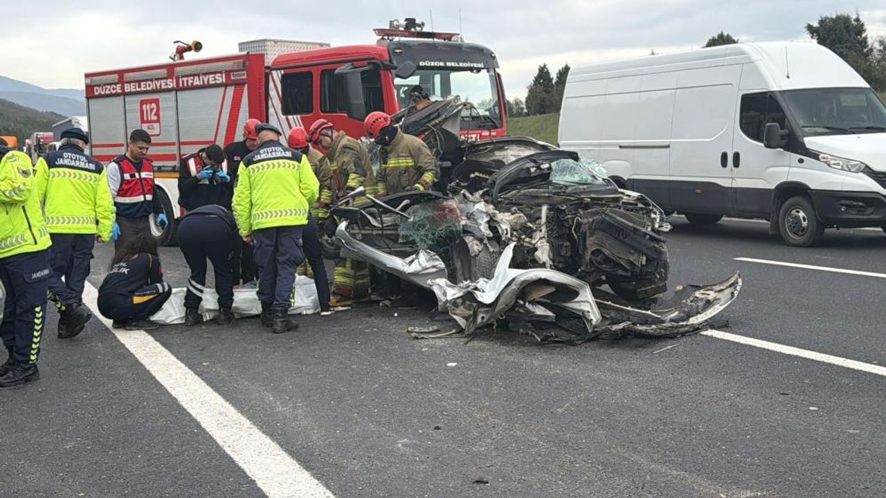 Kaza, saat 14.30 sıralarında Otoyolun Gümüşova rampaları mevkisinde meydana geldi. İstanbul istikametinde seyreden Hamza Güven (25) idaresindeki 34 BZN 727 plakalı otomobil, aynı yönde giden Hayati Erdoğan yönetimindeki 34 AZD 564 plakalı tıra çarptı. Çarpmanın etkisiyle sürücü Güven ile araçta bulunan Muhammed Furkan Bozar (20) otomobilde sıkıştı.
